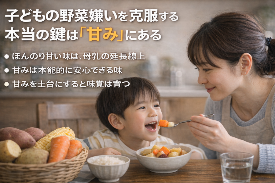 多くの親が悩む「子どもの野菜嫌い」。実は無理に食べさせるよりも、まずは“ほのかな甘み”を意識することが重要です。野菜の甘みは、乳幼児期の食経験や味覚の成長に密接に関わっています。