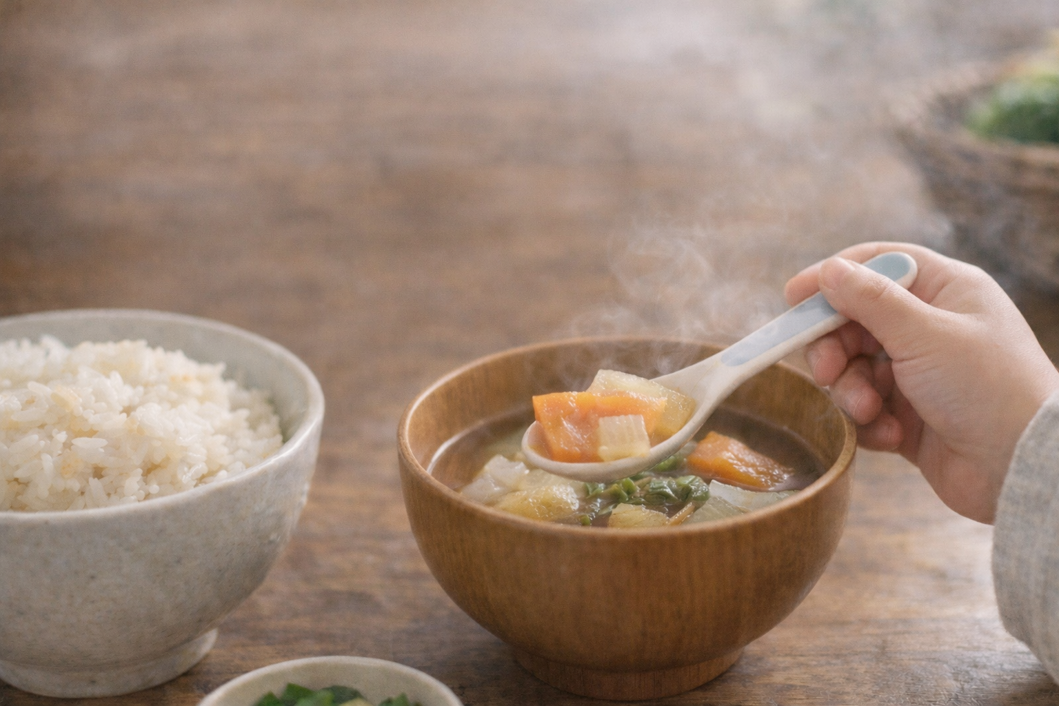 さらに、味噌汁には季節の野菜を加えることで、必要なビタミンやミネラルも自然に摂れます。体調がすぐれないときや、アレルギーなど食事に不安があるご家庭でも、無理なく取り入れられるのが魅力です。